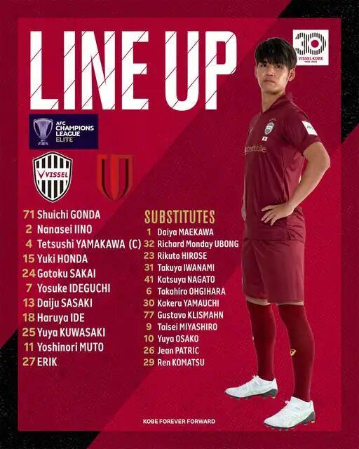 神戶勝利船替補(bǔ):1-前川黛也、32-理查德·蒙迪·烏邦、6-扇原貴宏、9-宮代大圣、10-大迫勇也、23-廣瀨陸斗、26-讓·帕特里克、29-小松蓮、30-山內(nèi)翔、31-巖波拓也、41-永戶勝也、77-古斯塔沃·克利斯曼。